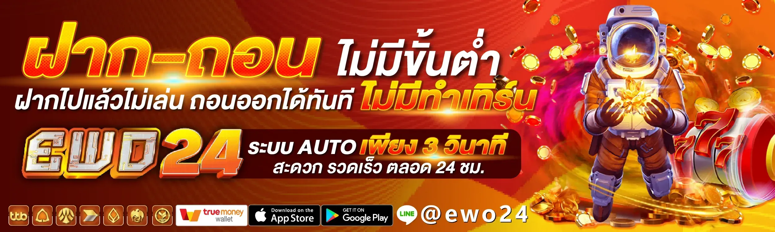 ระบบฝากถอนใน EWO24 ใช้เทคโนโลยี Auto-Processing ทำให้ผู้เล่นทำรายการได้ภายในเวลาเฉลี่ยเพียง 3–5 วินาที รองรับทั้งโมบายแบงก์กิ้งและ TrueMoney Wallet ไม่ต้องส่งสลิป ไม่ต้องทักแอดมิน ระบบตรวจจับยอดให้ทันทีแบบ Real-time